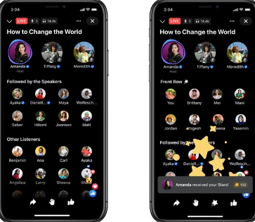 Clubhouse,可以创建主持人或加入与任何主题的公众人物的房间。与 Clubhouse 不同的是,任何人都可以加入 Live Audio Room,只要邀请最多可容纳 50 位演讲者和无限数量的听众。与 Facebook Gaming 类似,听众也可以通过星星来表达对演讲者的支持,这些星星可以将他们推到“前排”。