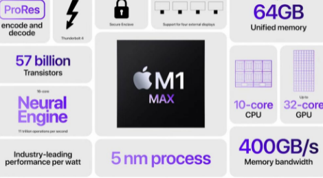 苹果在2021年新款MacBookPro中的高端M1Max芯片具有10核CPU和32核GPU。根据网上出现的M1Max基准测试,该芯片的单核得分为1749,多核得分为11542。准确地说,是13英寸MacBookPro机型的M1芯片的两倍。