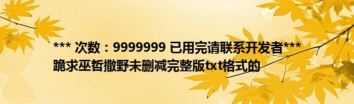 关于*** 次数:9999999 已用完请联系开发者*** 跪求巫哲撒野未删减完整版txt格式的这个很多人还不知道,今天菲菲来为大家解答以上的问题,现在让我们一起来看看吧!