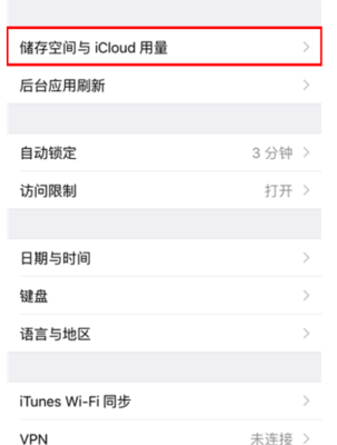 2、然后再退出上面的页面,现在接着点击进入“通用”的界面,随后在打开的页面中接着点击“储存空间与iCloud 用量”菜单项;